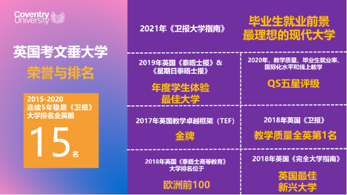 一直以來,考文垂大學憑借其創(chuàng)新式教學模式及雄厚的學術(shù)研究實力,獲得廣泛的影響力并且贏得全球性的聲譽;在學生體驗方面,考文垂大學注重培養(yǎng)學生國際視野,提供豐富實用的課外實踐活動。我們的職業(yè)指導團隊(Talent Team)將為學生提供英國和國際實習就業(yè)方面的建議與指導, 在撰寫簡歷和工作申請流程方面給予支持。