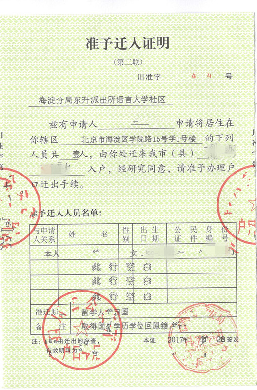 3.留學(xué)人員在留學(xué)期間要求終止存放,將戶口遷回原籍。